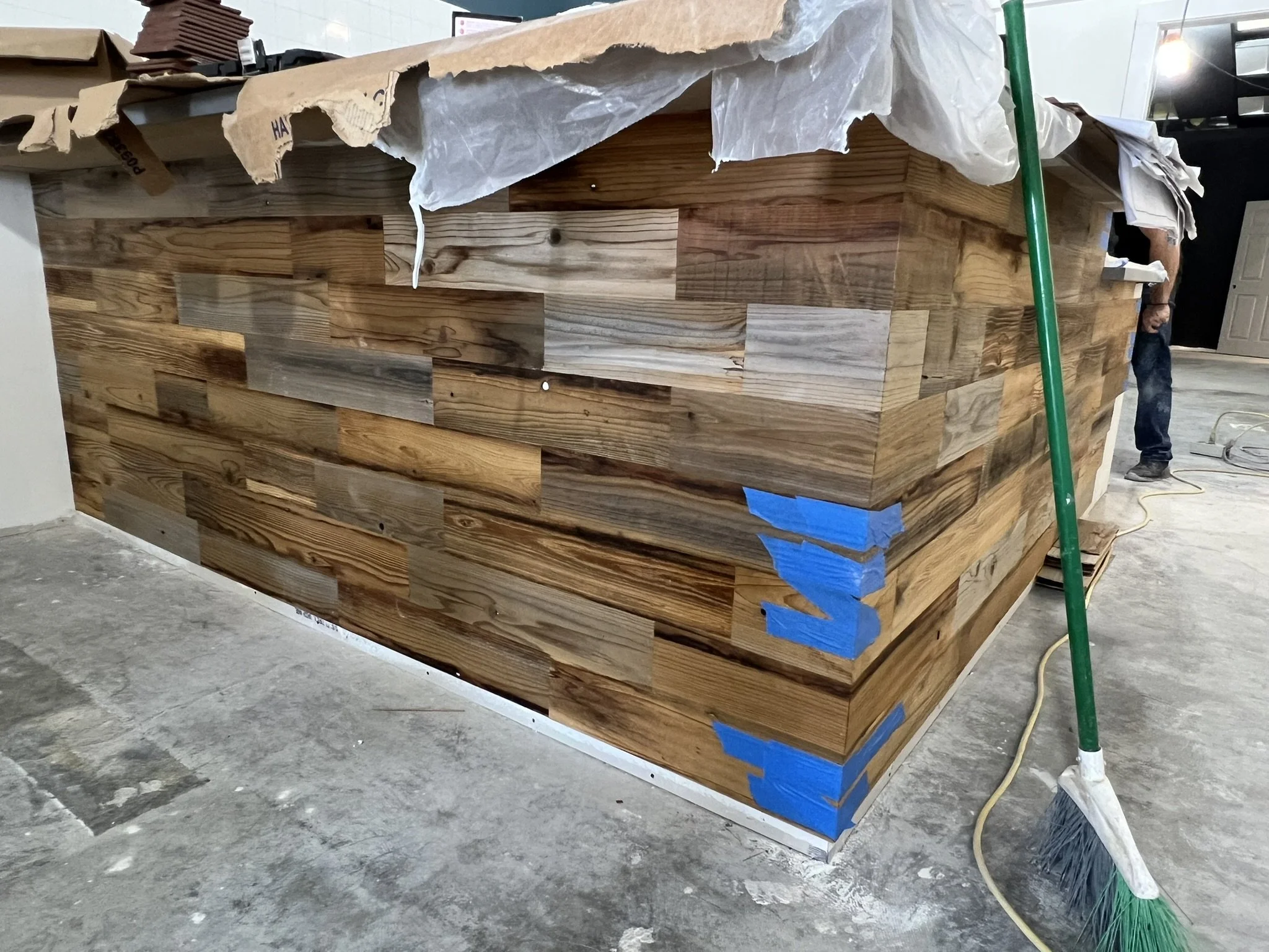 RAD used a reasonably priced thin wood material with peel and stick backing to add warmth and texture to the feature bar. Crafters can purchase drinks, snacks and art supplies.