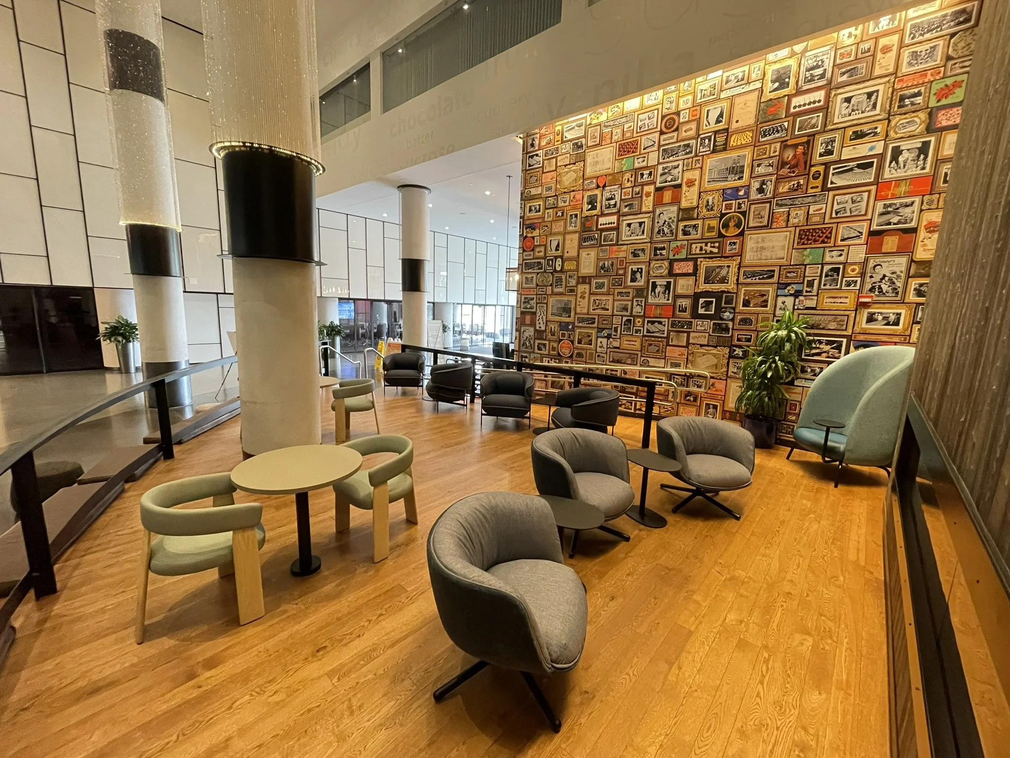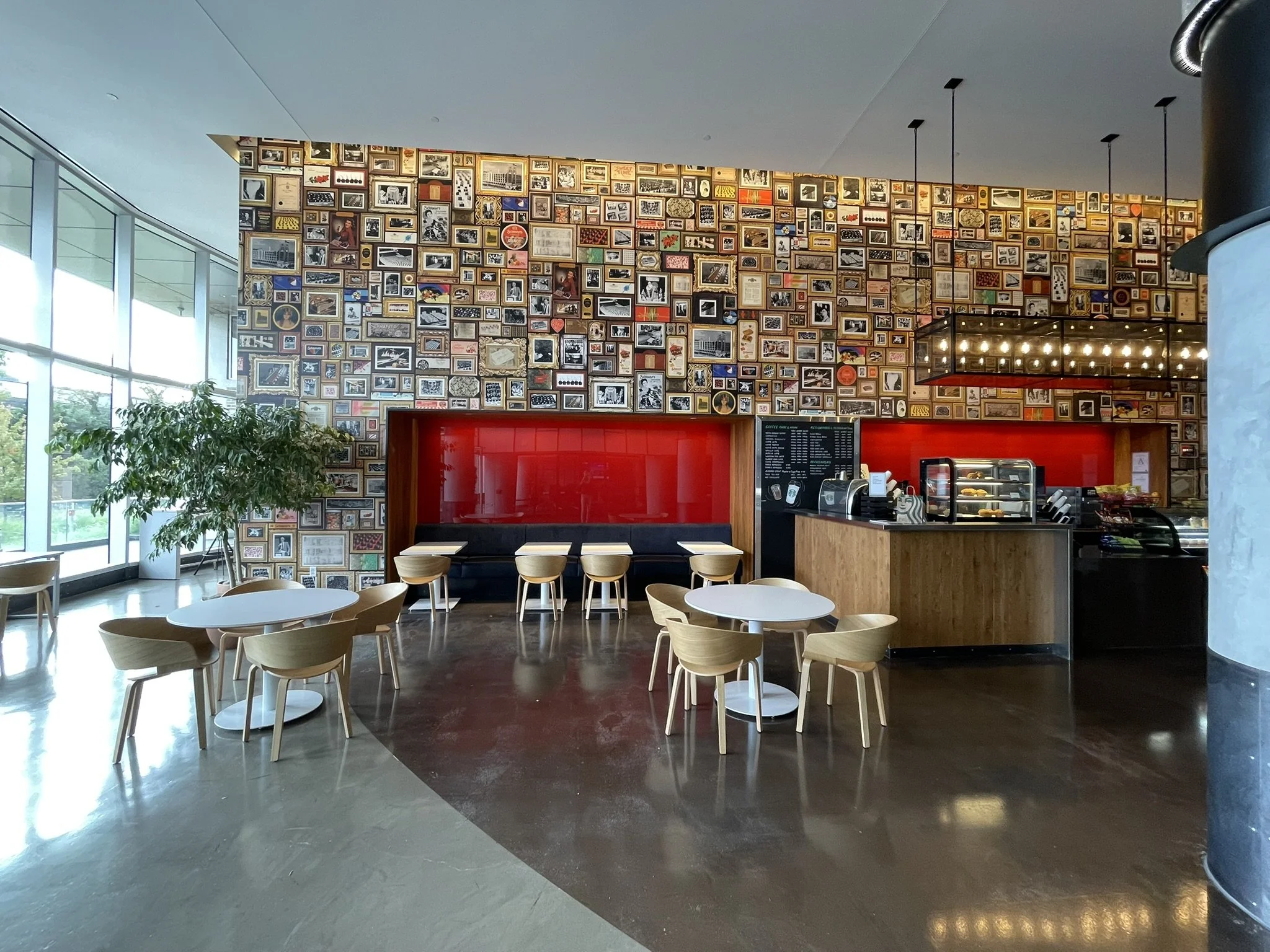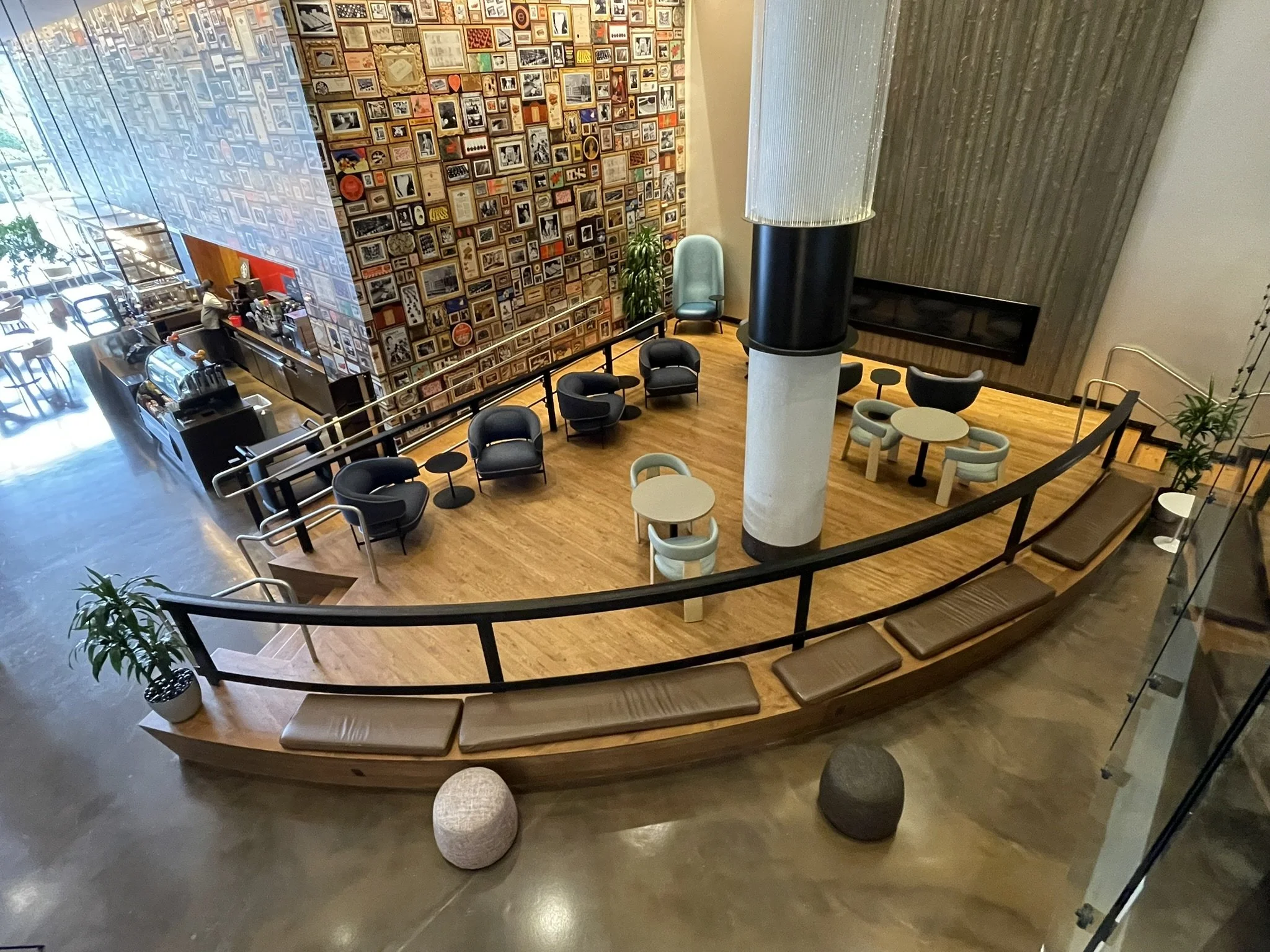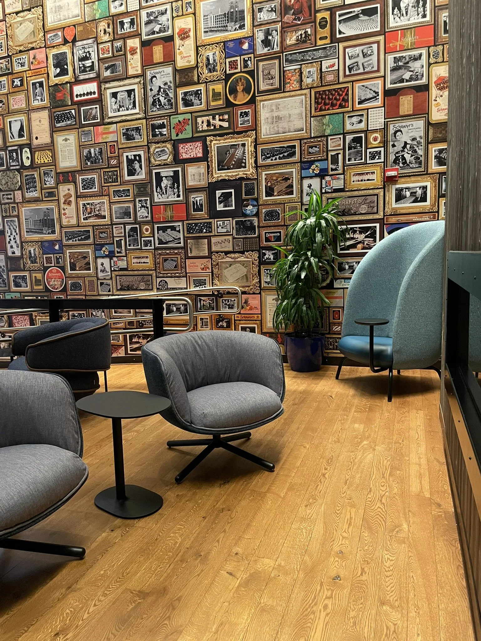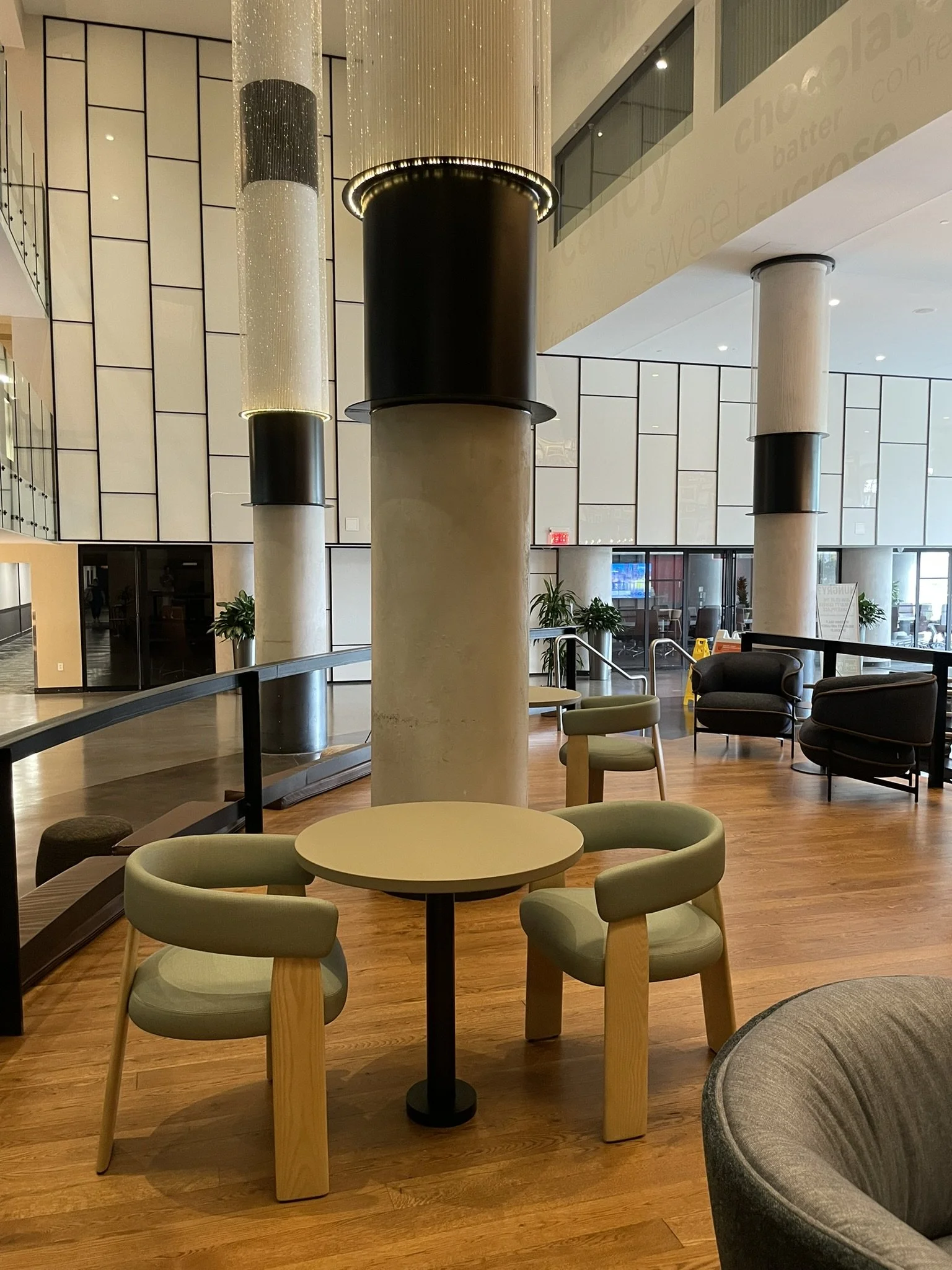 This design is still inspired by the buildings candy making roots. The goal was to tone down the candy apple red and amp up the sense of cozy and hygge-vibes that everyone has come to know and love. The new furniture is intended to support working in this one-of-a-kind third space. Tenants were already taking selfies in signature pieces and declaring ownership of certain window seats on Day 1 of the unveiling.